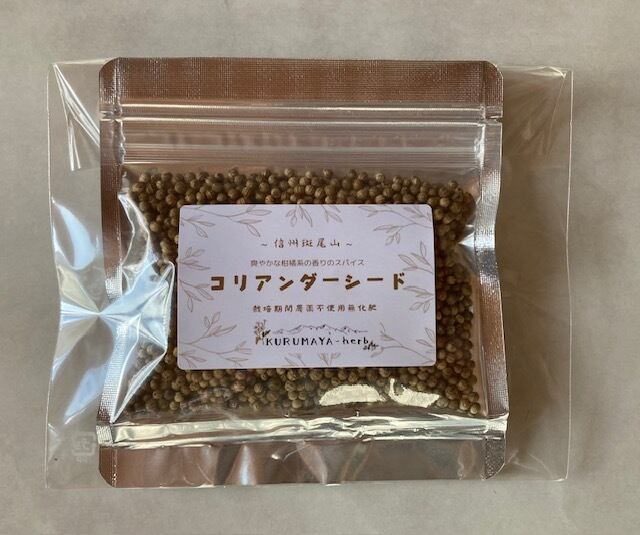 KURUMAYA-herbにご来店いただきありがとうございます。KURUMAYA-herbは長野県信濃町斑尾山中腹に位置するハーブ農家です。その昔は水車小屋があり米つき屋でしたのでKURUMAYA(車屋)は屋号です。冬は豪雪地帯になり夏~秋の間オープンガーデンにしております。斑尾山から流れる雪解け水と湧き水をハーブの栽培に利用し、栽培期間農薬不使用無化肥で育てております。肥料は自家栽培の米糠 籾殻 藁 山林の落ち葉 木灰を使い大自然の恵みをふんだんに取り入れ自然のままに育てたハーブは香りが良く安心してお使いいただけます。コリアンダーシードは、葉の部分のコリアンダーと香りが違い爽やかな柑橘系の香りがいたします。お肉や卵 豆などの材料と調和して風味を高めてくれます。カレーやエスニック料理には欠かせないスパイスの一つです。麻婆豆腐にミルして入れたり、ピクルスやマリネの香り付けにもよいです。また、クッキーなどのお菓子にも合います。商品は洗浄 加熱殺菌処理をしてございます。